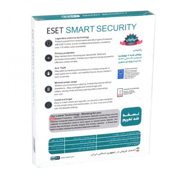 این محصول کامل ترین نسخه از آنتی ویروس ESET یعنی نسخه اسمارت سکیوریتی می باشد که شامل آنتی ویروس، فایروال، پسورد منیجر، آنتی تروجان و تمامی برنامه های امنیتی شرکت ESET در قالب یک نرم افزار واحد است.