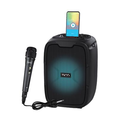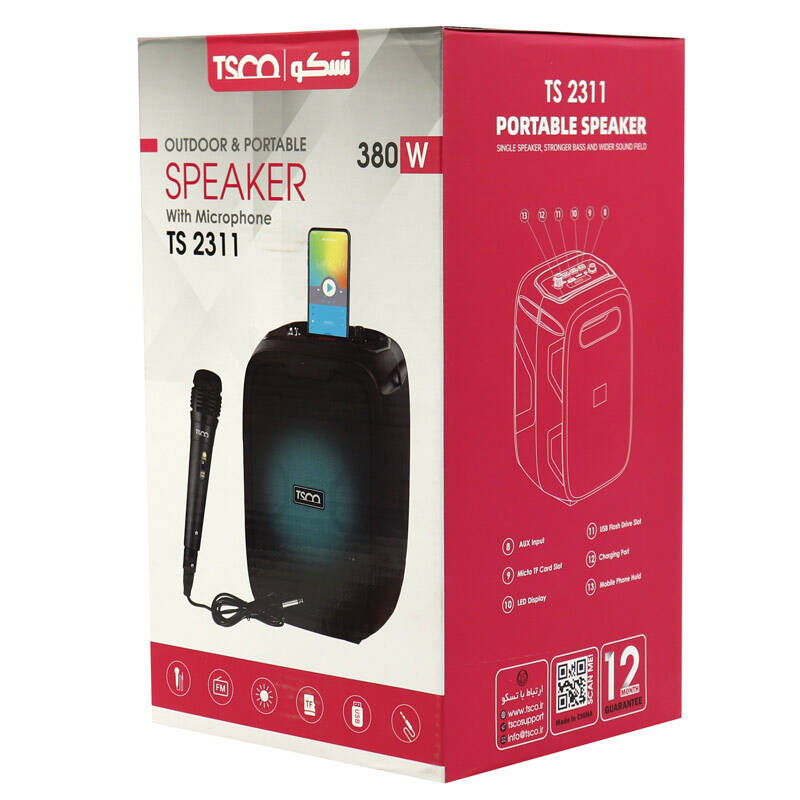 شما از طریق درگاه Micro USB میتوانید اسپیکر را شارژ کنید. در طراحی این اسپیکر در بخش بالایی دستگاه بخش تنظیمات اسپیکر قرار گرفته که شامل ورودی میکروفن، پورت AUX، یک درگاه USB و درگاه TF هست تا شما بتوانید به طرق مختلف موسیقی دلخواه خود را گوش دهید. علاوه بر اینها یک مانیتور جهت نمایش مود پخش و شماره آهنگ نیز قرار دارد. در کنار اینها 4 دکمه برای پخش آهنگ و تییر حالت پخش و همچنین عقب و جلو زدن آهنگ روی این اسپیکر تعبیه شده است. یک بخشی نیز برای زیاد و کم کردن صدا در نظر گرفته شده است. اسپیکر تسکو TS 2311 دارای یک دسته برای حمل بوده که کار شما را بسیار راحتتر میکند. همچنین شرکت تسکو با طراحی میکروفن به رنگ مشکی و طلایی بوده و سعی کرده تا جذابیت بصری این میکروفن را بالا ببرد. و میتوان گفت تا حد زیادی نیز موفق بوده است. نورپردازی RGB هنگام روشن کردن این اسپیکر خودنمایی میکند که زیبایی خاصی به این دستگاه بخشیده است.