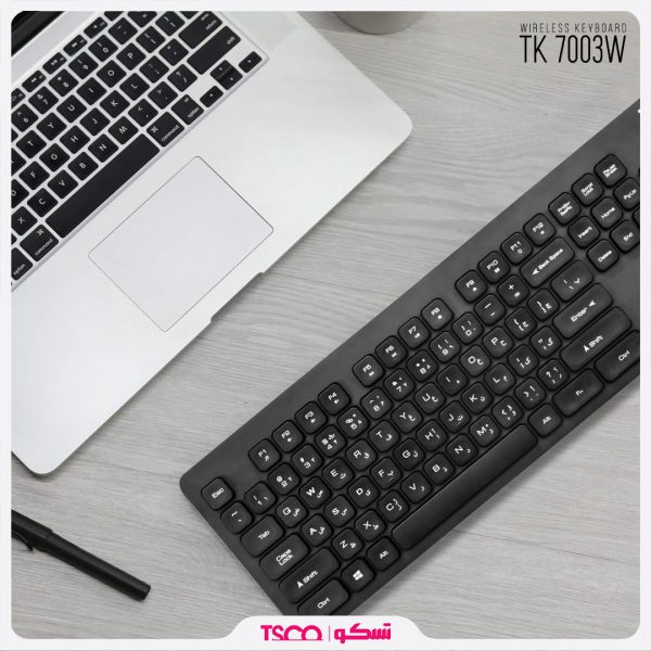 اتصال کیبورد تسکو مدل TK 7003W از طریق یک دانگل USB صورت پذیر است که برد صفحه کلید آن 8 تا 10 متر میباشد، انرژی مورد نیاز این کیبورد بواسطه ی 2 عدد باتری تامین میشود.در طراحی این محصول از 103 عدد کلید و 12 عدد کلید میانبر و کاربردی و چراغ نشانگر CAPS LOCK/NUM LUCK استفاده شده که کلیدها قابلیت ضربه پذیری تا 10 میلیون بار را دارند.