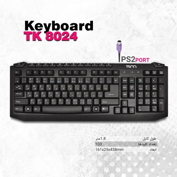 کیبورد تسکو مدل TK 8024 یک کیبورد باسیم است که با کانکتور PS2 به سیستم شما متصل میشود. دکمههای این کیبورد بافاصله بسیار کم از هم طراحیشدهاند این مسئله دو مزیت برای این کیبورد به دنبال دارد. یک: عدم ورود گردوغبار به داخل کیبورد. دو: سرعت تایپ بالا به خاطر نزدیکی دکمهها. همچنین این کیبورد با 103 دکمه اصلی و 14 دکمه شرت کات یا میانبر ده میلیون ضربهپذیری، 580 گرم وزن و کابلی به طول 1.8 متر آزادی عمل بالایی موقع استفاده به شما میدهد.